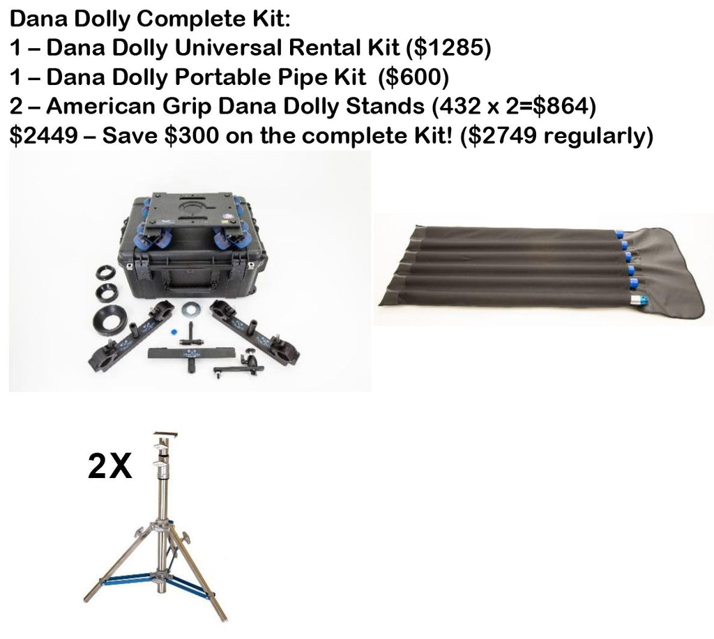 Dana Dolly Complete Combo Kit. All of our most popular products in one place. The Dana Dolly Universal Rental Kit, the Dana Dolly Portable Pipe Kit, and two American Grip Stands. Everything you need for up to a ten foot move in three sections just over three feet each. Made in USA.